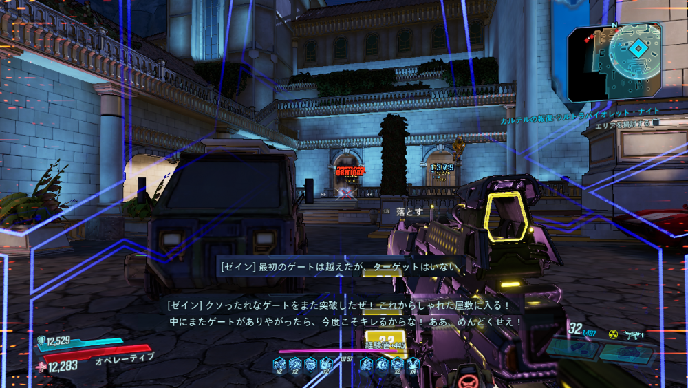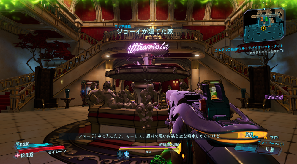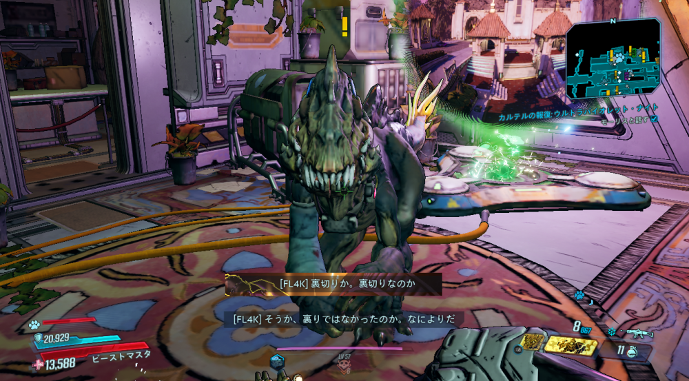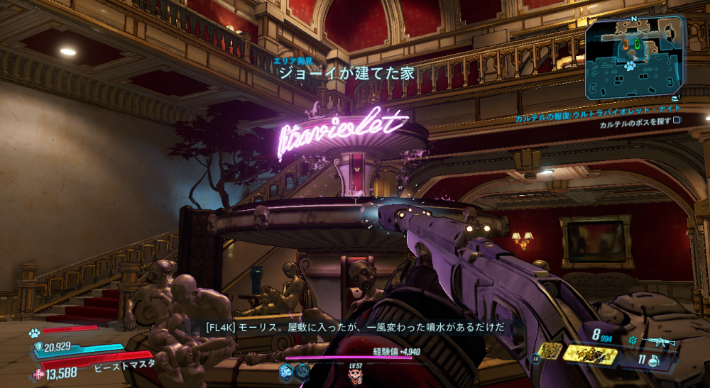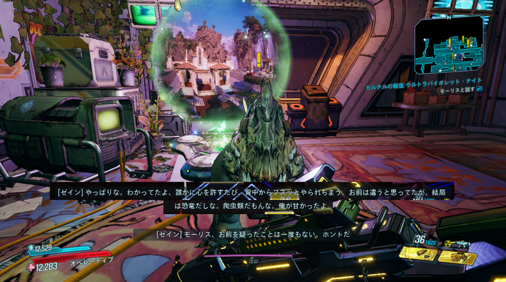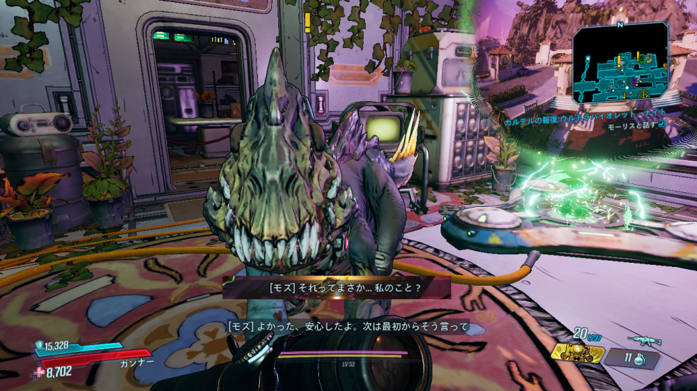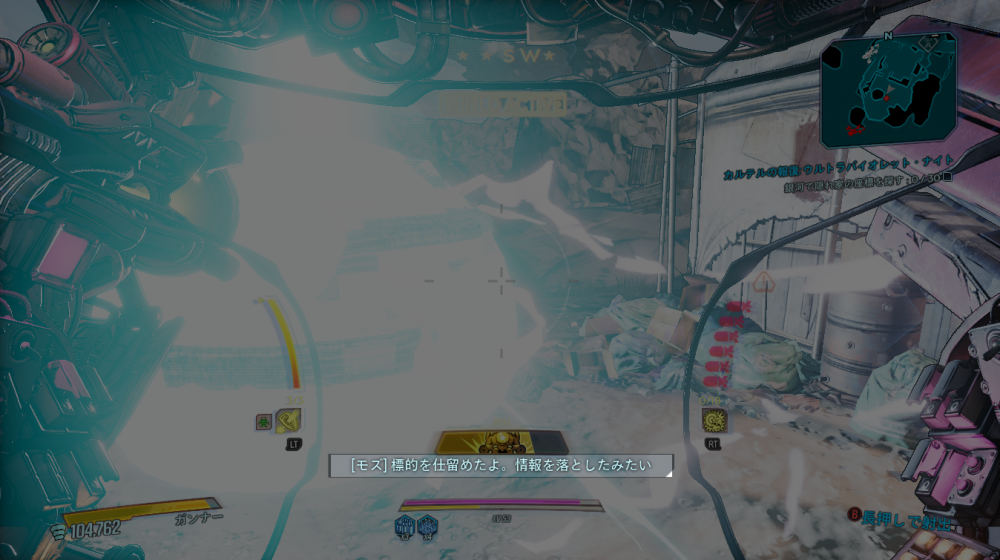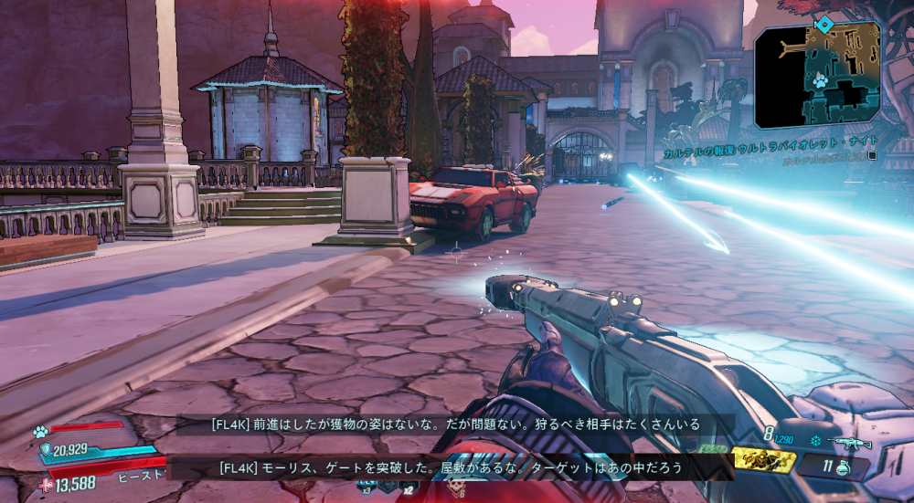 2020/05/22 Category : ボダラン3キャラ台詞 台詞:カルテルの報復 2020/4/26~2020/6/4 期間限定イベント「カルテルの報復」のキャラ個別台詞まとめ モズ→アマーラ→FL4K→ゼインの順番 1:モーリスに「【敵】から狙われているので助けてほしい」と依頼される 2:どうやらモーリスがカルテルとトラブルを起こした。その報復を受けているという。 3:銀河のどこかにいる、敵の居場所をどうやって特定したものか… 4:情報屋を倒し、ビーコン発動。敵の居場所の座標を入手する 5:情報を集めて敵の本拠地「ヴィラ・ウルトラバイオレット」に突入。1つめのゲートを突破。 6:2つめのゲートを突破。先に屋敷が見える。 7:屋敷の中には怪しい噴水 8:屋敷の中にはちょっとした謎解きも。 9:謎解き突破。 ボスを倒すとモーリスが怖い発言を… 10:モーリスの発言に警戒の色を見せるヴォルト・ハンター。 11:物言いが物騒なだけだった。安心して報酬をもらう。 おしまい。 PR Comment0 Comment Comment Form お名前name タイトルtitle メールアドレスmail address URLurl コメントcomment パスワードpassword