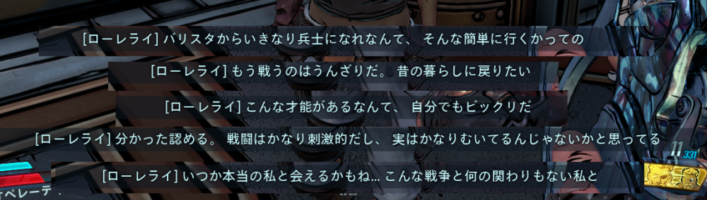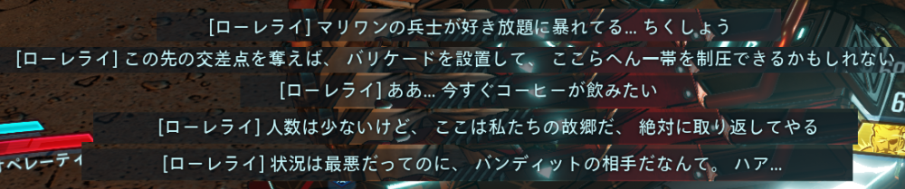 2019/10/20 Category : ボダラン3キャラ台詞 台詞:ローレライ(NPC) ・プロメティアで共闘 ・その他ストーリーの合間での台詞まとめ 他の出番としてエコー・ログ、マリワンテイクダウンのミッション関係 戦闘中: 銃を撃つ・グレネードを投げる・体力減少(?)で物陰に隠れる あんたに任せた 一瞬だけ! 今すぐそっちへ行ってやる! 撃ちまくれ! 鬱陶しい野郎だね! 撃てーー! 遠慮するなよ! お前は終わりだ! お前の力を見せてみろ! 覚悟しろ! 隠れるよ! カスタマーサービス経験者をナメるなぁ! 棺桶に叩きこんでやる! 軽く捻ってやる! 消えろ! 消え失せろ! 喰らいな、ウスノロ! グレネードだ! こいつでどうだ! こいつでも食ってな! コーヒーブレイク! これが欲しいんだろ! これでも食ってろ! ごめん、今ここ! さあ、やってやる! サプラーイズ! すぐに終わらせてやる! すぐに戻る! そこにいろよ! そこを動くな! ちょっと休憩! 手加減は無しだ! 敵を発見! まだ生きてるのか!? まだやれるぞ! 見つけた! 物陰っていいよね! ものすごい雑魚だなぁ~ 逃げるなよ! 逃げるべきだったな! 始めよう! ビビデ・バビデ・ドカーンと! ほら、行ったぞ! ちょっと待ってろ! 楽勝楽勝! よし、行くぞ! よし!一丁上がり! 私のおごりだ! 私の星から出ていけ! ダウン これは…マズいな… 誰か…エスプレッソ……トリプルで… ちょっと…無理かも… 復帰 あぁ…死ぬかと思った… えっと…ここどこ? 起きた、起きたってば! 完全復活! 戦線に復帰する! 治療してくれる 後で一杯おごれよ? 今回復してやる 落ち着いて、敵をよく狙え 今日は厄日だなー 砂糖がひとさじあるだけでなんでも大丈夫だって言うだろ? 手を貸すぞ なんだ眠いのか? 私の目の前で死ぬな 私一人働かせるつもり!?絶対許さない! (少し笑)私が居て良かったな! 治療完了 あんたは大丈夫だと思ってた! さあ行け! シャキッとしろ~! まだ休憩時間じゃないぞ! まだ戦えるだろ? 礼なら後でいい よし、良いぞ! よし、行こう! プレイヤーが治療成功 あぁ…死ぬかと思った 危なかったぁ… 本当にありがとう 仲間の助けあってこそだな! よくやってくれた! ・基地奪還前 ・基地奪還直前(扉を開ける前) ・基地奪還後、アテナスへ向かう前に話しかける サブ「ライズ&グラインド」でパワーコアを回収せずに放置すると何種類か台詞あり (コアを取るよう促すだけですが) パワーコアをセットしないでいるとやはり催促してくる。4種類? PR Comment0 Comment Comment Form お名前name タイトルtitle メールアドレスmail address URLurl コメントcomment パスワードpassword