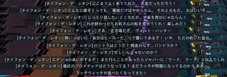 2019/12/22 Category : ボダラン3キャラ台詞 台詞:伝説のヴォルト・ハンター(NPC) タイフォン・デ・レオン ネクロタフェヨにて共闘 ■戦闘中■ あいつは私がやろう! いいぞ、かかってこい! 生きて帰れないと思え! お前に決めたぞ、若いの! お前達の出る幕じゃないぞぉ! お楽しみの時間だぞ! お疲れさん! お~~~!私の前で死ぬな! おおっと、まずい! うおぉ、すごいのが来たな! こいつは痛いぞ! 来い!雑魚め! これこそが…人生ってやつだ! グレネード行くぞ! グレネードは好きか?若いの! さあ吹っ飛べ! さあやるぞ、突撃だ! すぐに終わりそうだ! 弾け飛べ! 楽勝だな! たまには隠れるのもいい! 負け犬どもを蹴散らすぞ! 的になるのはごめんだぞ! 昔ながらの撃ち合いってやつだ! ■蘇生■ 大丈夫、深呼吸だ! 年寄りをこき使うもんじゃないぞぉ! 寝てる場合じゃないぞ! 私が診てやる、構わず撃ち続けろ! ■蘇生成功■ 十分休んだな!よし! ■ダウン~復帰■ 痛って… いよし!まだいけるぞ! うぁ…大丈夫、大丈夫…だ 英雄の帰還だ! ■その他/待機台詞■ ■資料画像■(ネタバレでしかないのでここに…) ■小ネタ■ 語彙が当然だが古臭い。が… 現代っ子なカリプソ・ツインズも同じ事を言ったりする。 ちょっとした伏線。 PR Comment0 Comment Comment Form お名前name タイトルtitle メールアドレスmail address URLurl コメントcomment パスワードpassword